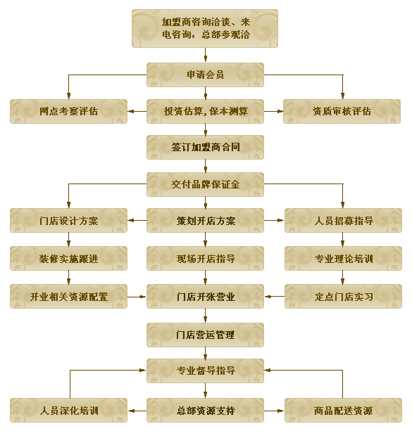 公司提供统一的专卖店管理手册,严格统一专卖店形象,根据各店面差异,免费量身定制设计、装修方案,对店面装修费用提供50%的支持,并提供专卖店宣传画册、包装材料及促销方案等支持;
