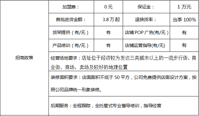 (1)代理加盟商具有品牌经营的理念,有良好的信誉度和操作资金,遵守公司的各项章程,与公司同步发展。丰富的品牌服装经营理念 品牌维护及推广能力。