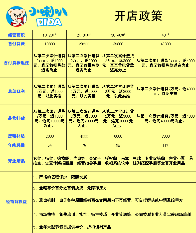 提供相应的商标、商号、商品和知识产权,免费提供全套品牌VIS视觉形象系统;提供详细开店启动方案,店面运营,销售指导,免费装修方案,免费开业赠品。