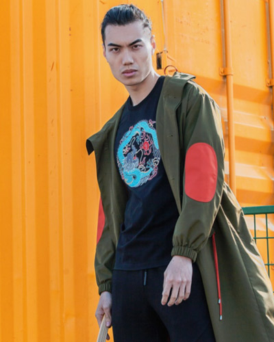 重视面料与面料间的缝合与搭配,萃取女装常用的细腻质感与辅料,运用在男装的设计中,中和了男装在市场设计中硬挺的质感。并且与中国传统的“龙、鹤、祥云、古籍、建筑”等元素相搭配,点睛品牌中的系列单品。
