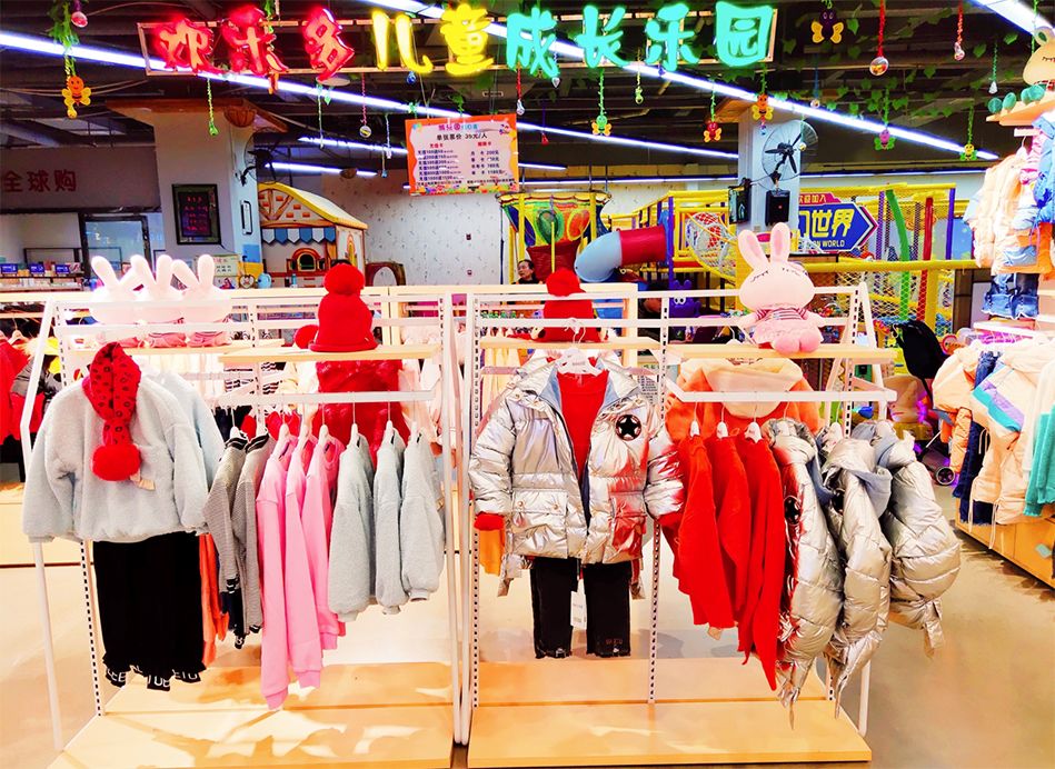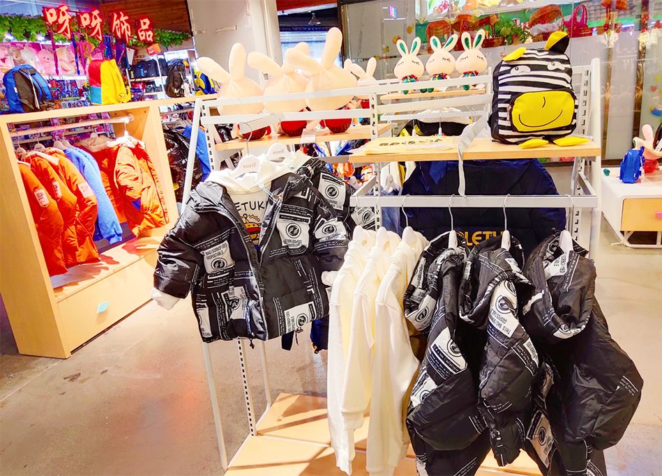 店铺四周产品饱满且整齐地陈列好,路过店铺的行人更容易被产品吸引,中间留有稍大空间,便于到店的孩子嬉戏玩耍。