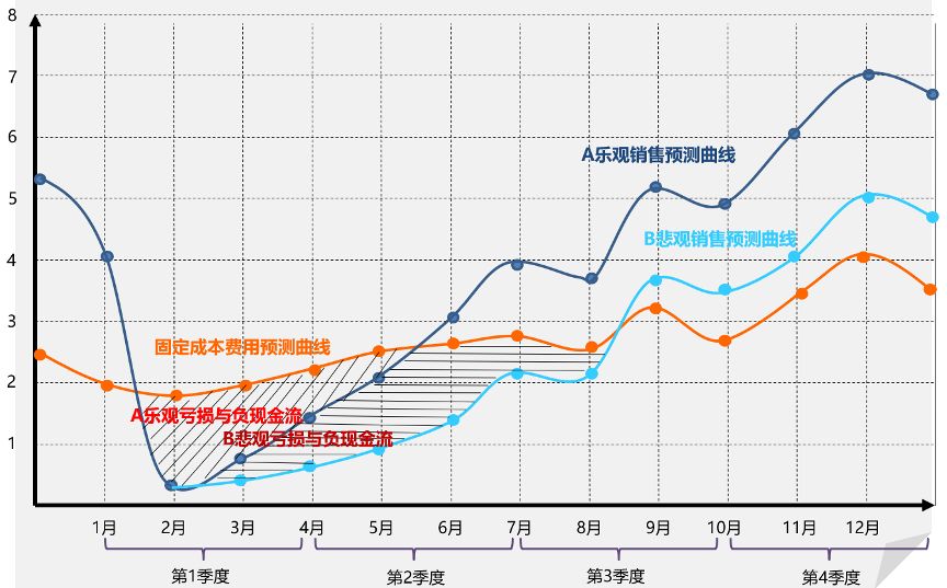 在《2020年不同疫情程度影响下的销售收入与成本费用预测曲线模拟示意图》中,阴影部分就是亏损与负现金流,各个企业可根据实际销售与成本费用数据模拟预测。