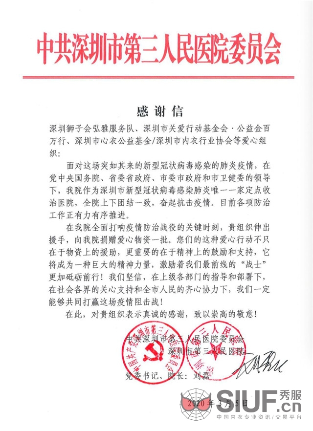 病毒无情人有情。3月5日,由深圳市布寻服饰有限公司、深圳市宜恒服饰有限公司、广东凯迪服饰有限公司、深圳闺秘雅服饰实业有限公司、中山芭蒂欧服装有限公司、深圳前海大健康智造科技有限公司共同捐赠的男士/女士内裤、家居服、防护服、口罩等价值近百万余元的抗疫物资承载着内衣行业浓浓的爱心抵达指定新冠肺炎的唯一收治医院——深圳市第三人民医院,为奋战在抗疫一线的医护工作人员们送去真挚的关怀和切身的温暖。