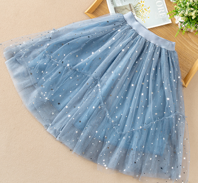 网纱上还有点点星光,星光与蓝色的裙身建立了一种奇妙的默契,装饰效果满分,做个浪漫的仙女宝贝就靠它。