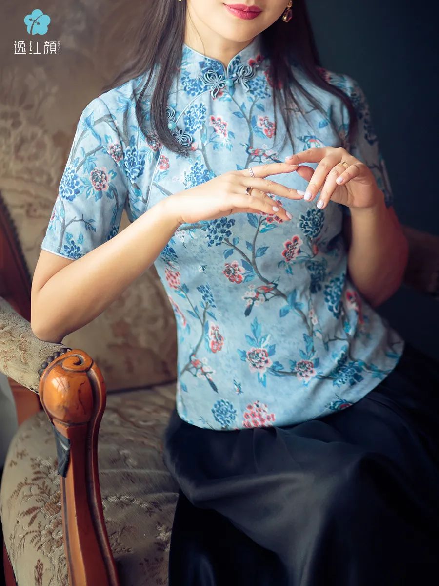 文君一件中式风格的上衣~ 清透的蓝色旗袍上衣,给人一种“江南可采莲,莲叶何田田。”的感觉~ 江南气息的雅致都在袍子里。