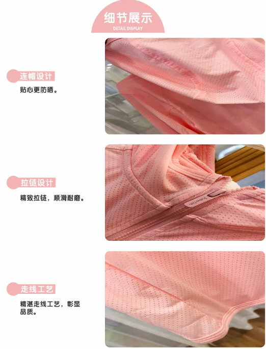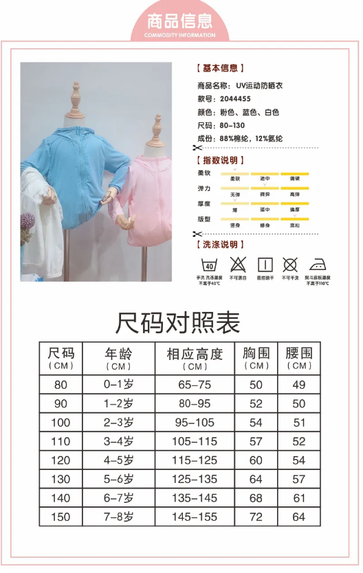 粉红、白、浅蓝三种颜色,很百搭,男女孩都可以穿,粉色特别适合女孩子穿着,非常时尚,浅蓝色将男孩子的皮肤衬得特别白净,这件衣服的正反面都有开孔设计,既透风又凉爽有助散热,内里网格设计拼接,超透气的,春秋季节可将它作为薄外套穿着,夏季可以当防晒服或者空调间的小外套,多场景使用,宝妈们是不是迫不及待想要入手了!