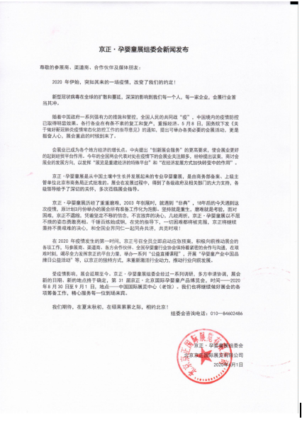2020年是不平凡的一年,全国人民共克时艰,万众一心!随着全国疫情防控向好态势进一步巩固,防控工作从应急状态转为常态化,国务院于5月8日发出《应对新型冠状病毒感染肺炎疫情联防联控机制关于做好新冠肺炎疫情常态化防控工作的指导意见》,意见的出台给展会业按下启动键,展会业迎来了期盼。在这普大喜奔的利好刺激下,作为母婴行业极具影响力的行业大展,同时也是中国国际展览中心每年的十大展会之一,京正·北京孕婴童展受到政府部门的关注,展会能否顺利举办牵一发而动全身。在以商务部等多个政府部门的帮助和指导下,在中国国际展览中心、各省行业协会,以及孕婴童行业同仁的关心和支持下,经过多方协商,第31届京正·北京孕婴童展的举办时间最终确定为8月30日至9月1日,举办地点为中国国际展览中心(老馆),官方新闻发布如下: