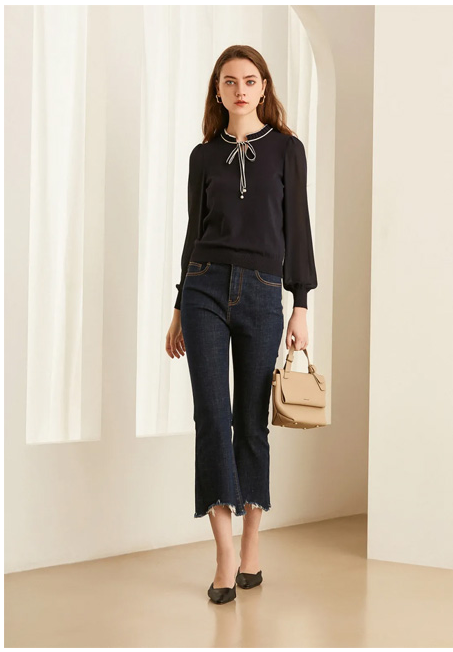 学院风的撞色荷叶褶边蝴蝶结设计,带来温婉甜美的淑女气息,仿真丝的碎褶泡泡袖,爽滑垂坠有质感,搭配不规则毛边的洗水牛仔裤,带来满分的自在甜美。