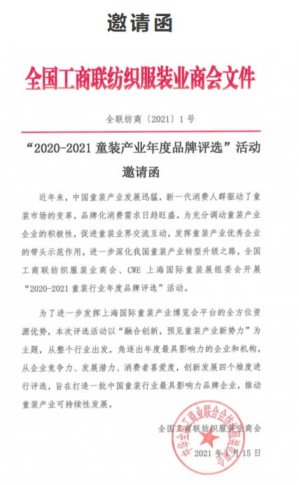 近年来,中国童装产业发展迅猛,新一代消费人群驱动了童装市场的变革,品牌化消费需求日趋旺盛。为充分调动童装产业企业的积极性,促进童装业界交流互动,发挥童装产业优秀企业的带头示范作用,进一步深化我国童装产业转型升级之路,全国工商联纺织服装业商会、cwe上海国际童装展组委会开展“2020-2021童装行业年度品牌评选”活动。