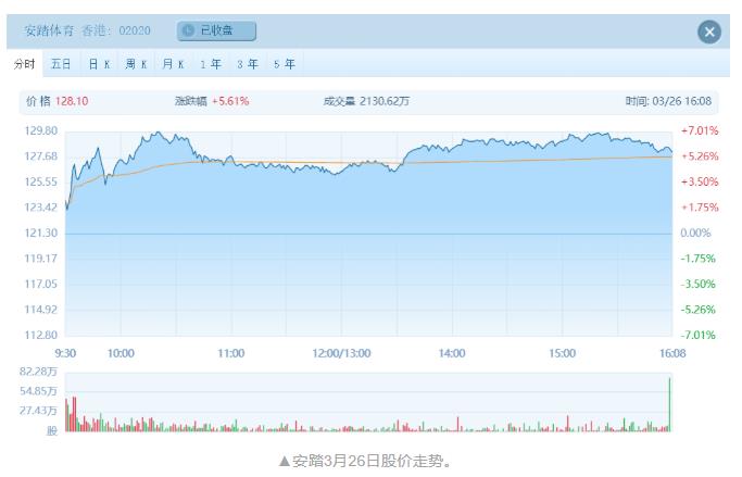 截至3月26日收盘,安踏股票股价128.1港元,收涨5.61%,市值达到3463亿港元。