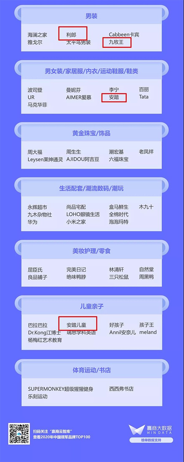 近日,商业地产数据平台赢商网联合中城研究院发布了“2020年中国领军品牌top100”。安踏、安踏儿童、利郎、九牧王等晋江品牌上榜。