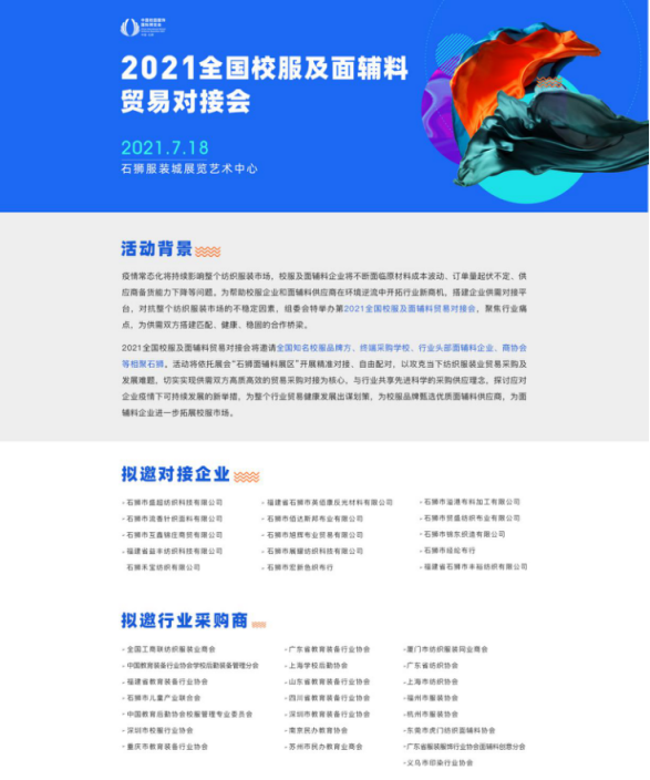 2021全国校服及面辅料采购对接会将邀请全国各地行业商协会相聚石狮,与面辅料企业现场对接,为整个行业贸易健康发展出谋划策,为校服品牌甄选优质面辅料供应商,为面辅料企业进一步拓展校服市场。