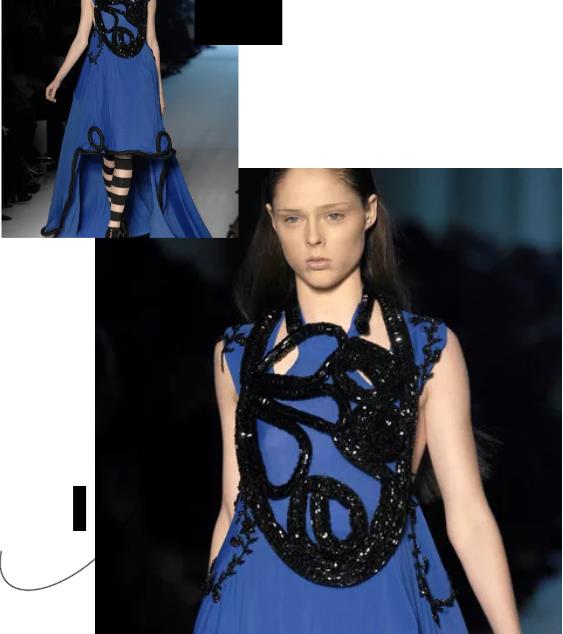 givenchy2007年的早春系列也出现了克莱因蓝的元素,垂感十足的裁剪,配以传统中国结的编织手法,赋予了这一抹蓝更多想象力的空间。