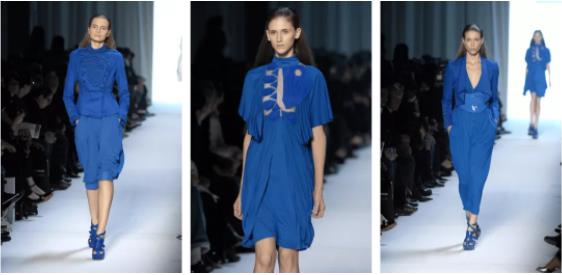 joan galliano执掌时期的christian dior,在2007年的秋冬系列中就展出了克莱因蓝色调的裙装。黄蜂腰以及宽松裙装的剪裁、点缀以奢华的印花刺绣、加上克莱因蓝纯粹又高贵的色泽,更凸显christian dior华美、高级的时尚氛围。