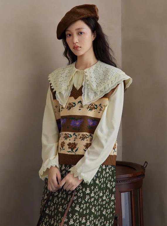 {撞色马甲+蕾丝领衬衫=轻复古格调}