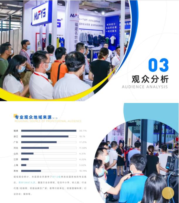 根据组委会统计,本届展会共接待了8112位来自全国各地的专业观众,共计13667人次,覆盖行业全领域,包含中小学、幼儿园;行业代理/经销商;校服品牌及厂家;教育行政单位;校服面辅料商;行业协会;媒体等。