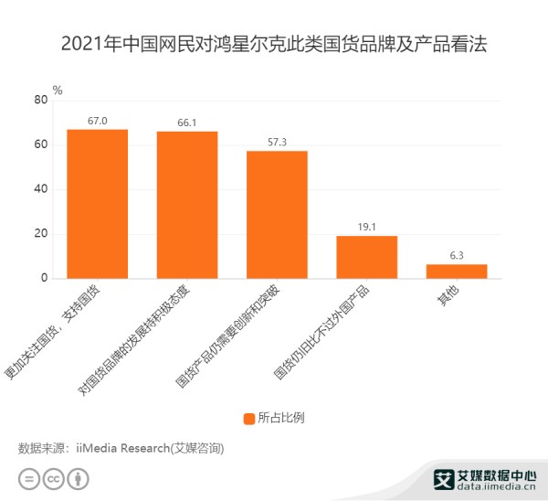 从2021年中国网民对鸿星尔克此类国货品牌及产品看法数据来看,有67%受访网民表示会更加关注和支持国货,其次有66.1%网民表示对国货品牌的发展持积极态度,也有网民认为国货产品仍需要创新和突破,占比为57.3%。此外,还有19.1%网民认为国货仍旧比不过外国产品。