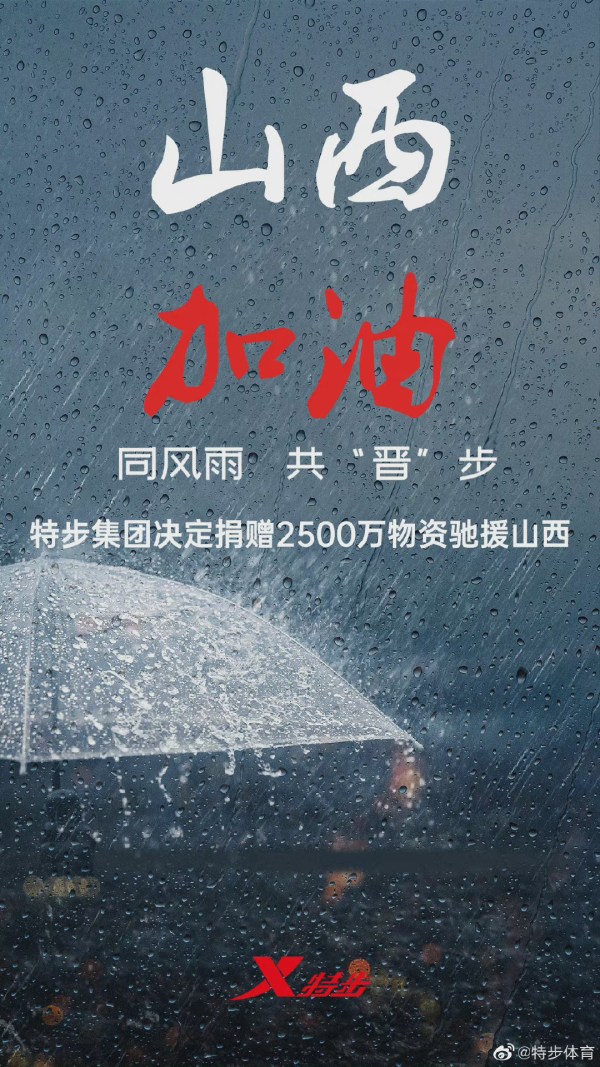 山西遭遇持续强降雨灾害,灾情牵动人心。为帮助山西人民抗击灾情以及灾后重建,特步集团决定捐赠2500万元物资驰援山西抗灾。