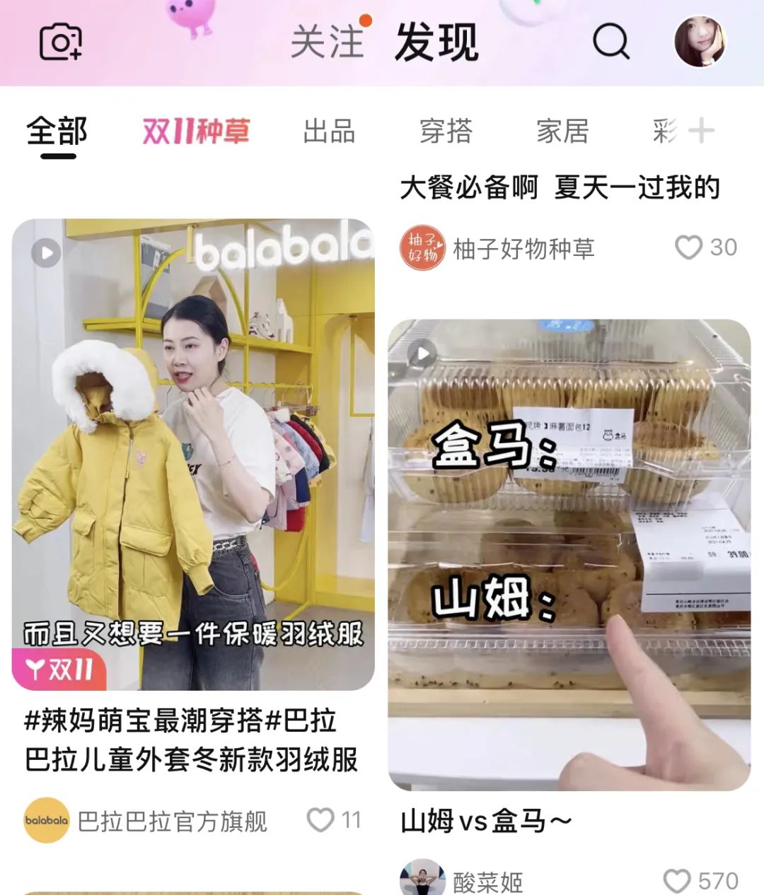 这种变化,从10月1日就已体现,淘宝直播和站内的内容渠道开启了种草节奏。通过直播看点、短视频等渠道,把消费者想要的货品进行内容生产。官方数据显示,目前平台已有 2.3亿种草用户,60亿篇种草内容。