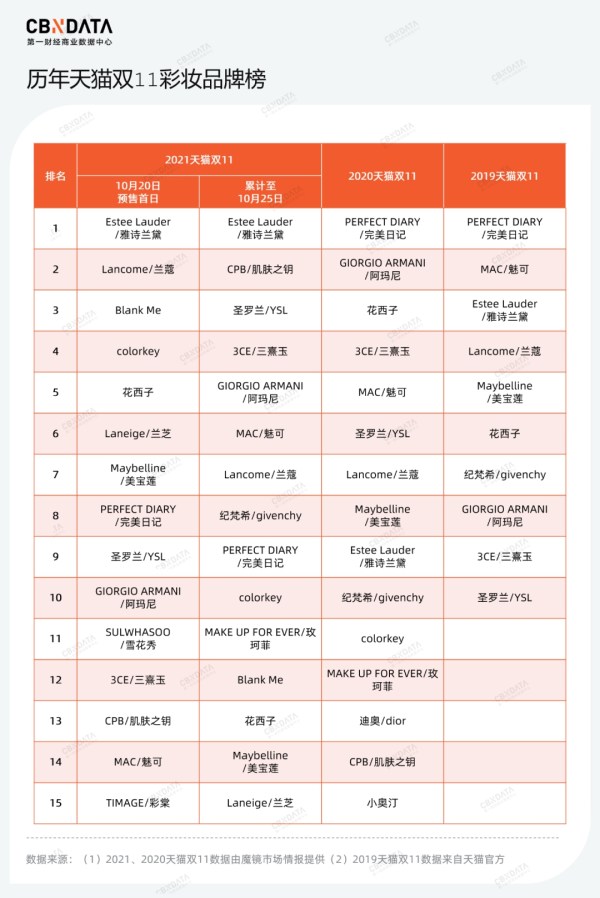 完 美日记曾经力压雅诗兰黛、兰蔻等国际大牌,登顶天猫双11彩妆品牌榜冠军,今年尽管在李佳琦和薇娅直播间都有亮相,成绩却平平无奇。据CBNData统计,预售首日,完 美日记仅排在天猫双11彩妆品牌榜第八。