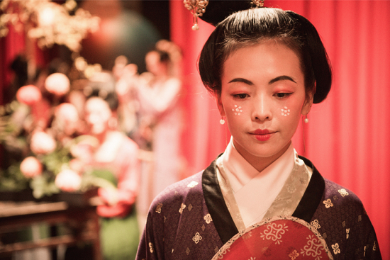 浓,渐暖,上升之气也。芦雪庵的消寒会上,众人精心装扮,流光溢彩,金翠辉煌,屋内燃鼎炉以取暖,屋外则笼两袖以御寒。此片段中,生活在左运用现代手法来呈现西阵织以及敦煌壁画的华丽,用工艺与色彩上的“融”,来烘托光照日暖的氛围,从而表达日渐升腾的“浓”。