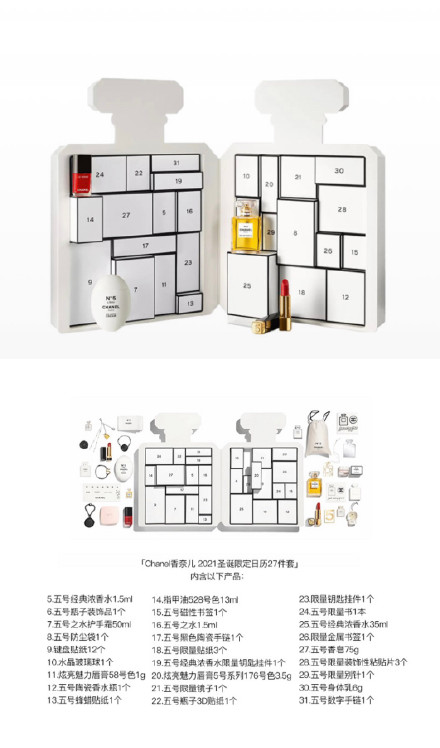 其实,这一款香水状礼盒并不是香奈儿品牌发售的盲盒,而是2021圣诞限定日历,CHANEL 创建了一个编号为 5 到 31 的日历,意为每一天都是一个庆祝活动,礼盒中的产品也在外包装上标注清楚。