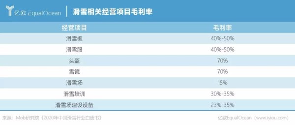 高客单价撑起了滑雪装备的盈 利能力。Mob研究院数据显示,滑雪装备中的滑雪板、滑雪服毛利率约为40%-50%,头盔、雪镜毛利率可达到70%;而雪场毛利率约为15%,滑雪培训毛利率为30%-35%,滑雪场建设设备毛利率则在25%-35%之间。