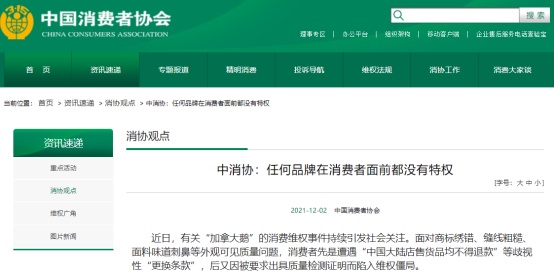 据悉,央广网也发表过声明批评加拿大鹅质量差拒不退货是满满的双标,用地域来区别对待消费者,必定不被中国法律所容。消费者权 益的保护,也绝不是某个厂家一纸条款就能有“豁免权”的。