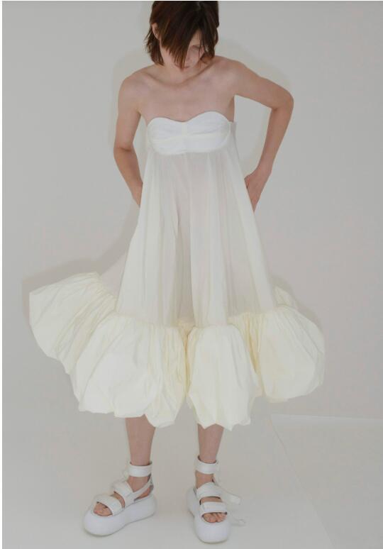 首款新作 magnolia 连衣裙采用上窄下宽的裙身设计,轻盈的立体衬裙令裙身更为挺括醒目;第二款 narcissus 连衣裙同样采用喇叭廓形,搭配心形领口和醒目的花冠形荷叶边;iris 修身紧身连衣裙正面采用折叠设计,打造垂褶效果,可于举手投足间随身轻舞。最后,calla 无袖连衣裙为该系列增添点睛之笔,正面采用双层修身廓形,背面则饱满宽松,并点缀精妙开衩。
