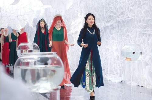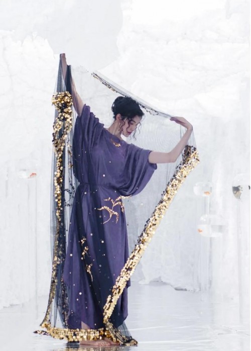 a:这场100个look的秀有十个场景,古今中外和梦相关的传说和人文文学作品,但这一切背后其实最想说的一点并非这十个主题,而是想再次对一个当下话题的思考:可持续设计。