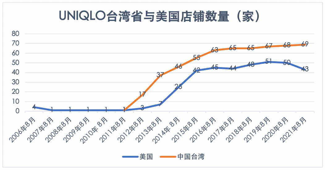且不说韩国,就是我国人口2000万的小地方台 湾,都能开出69家优衣库,超越3亿多人的美国市场: