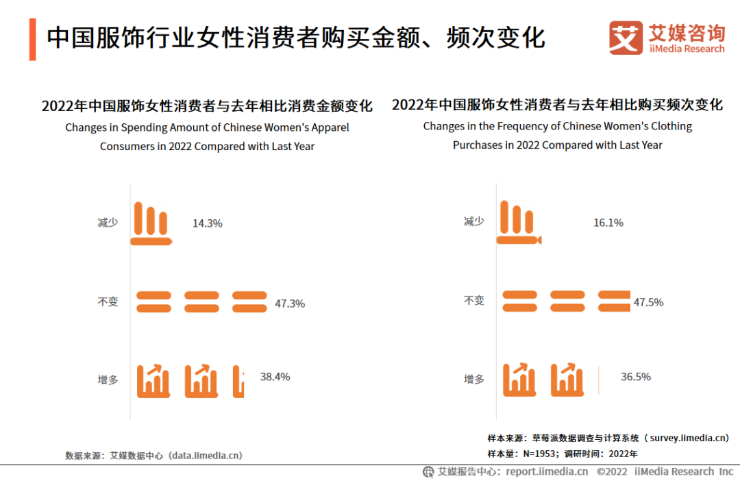 调研数据显示,中国服饰女性消费金额同比上年增加的占比为38.4%、不变为47.3%;消费频次同比上年增加的占比为36.5%、不变为47.5%。