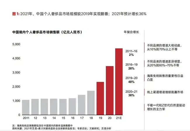 根据咨询机构贝恩公司的报告,2021年中国奢侈品销售额达到了4710亿元,同比2020年增长36%,较2109年近乎翻番。贝恩公司同时还预计中国将在2025年成为全球***的奢侈品消费市场。