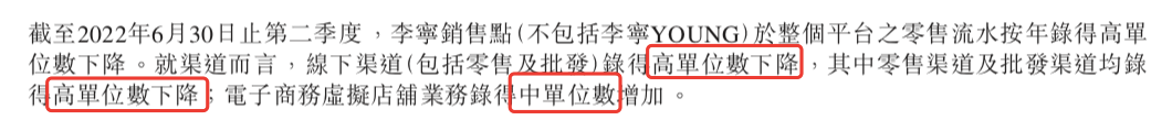 但从另一个数据可以侧面印证,经销商激增的订货量或许并没有卖到客户手中,而是压在了经销商的仓库里。李宁财报披露,截至2022年6月30日止 ,李宁的线下渠道流水下降,其中零售和批发都下降。李宁未披露具体下降数字,仅用“高单位数”来形容。这亦可看出,2022年散发的多地疫情对李宁线下生意确实有较大影响。而经销商库存高企,也可能影响下半年这部分收入。