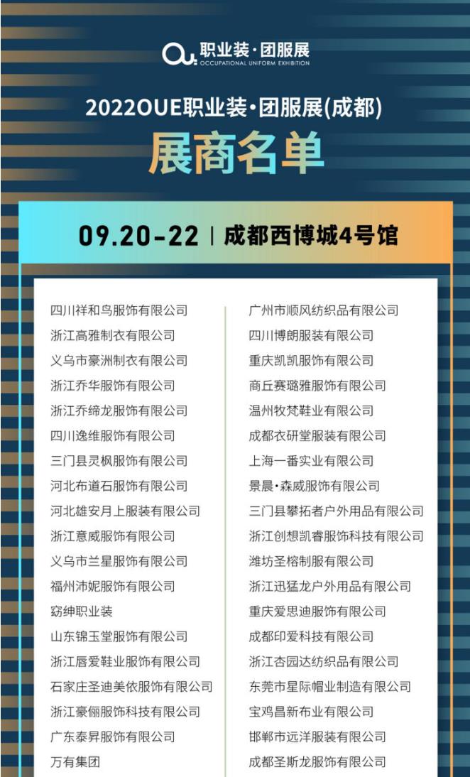 随着疫情形势稳中向好,成都进入全面恢复正常生产生活秩序,组委会在充分听取各方意见后,经请示相关政府主管部门并与展馆多方沟通协调审慎决定:“2022oue职业装·团服展(成都)”调档时间已定,将于2022年9月20-22日举办,地点:成都·中国西部国际博览城。