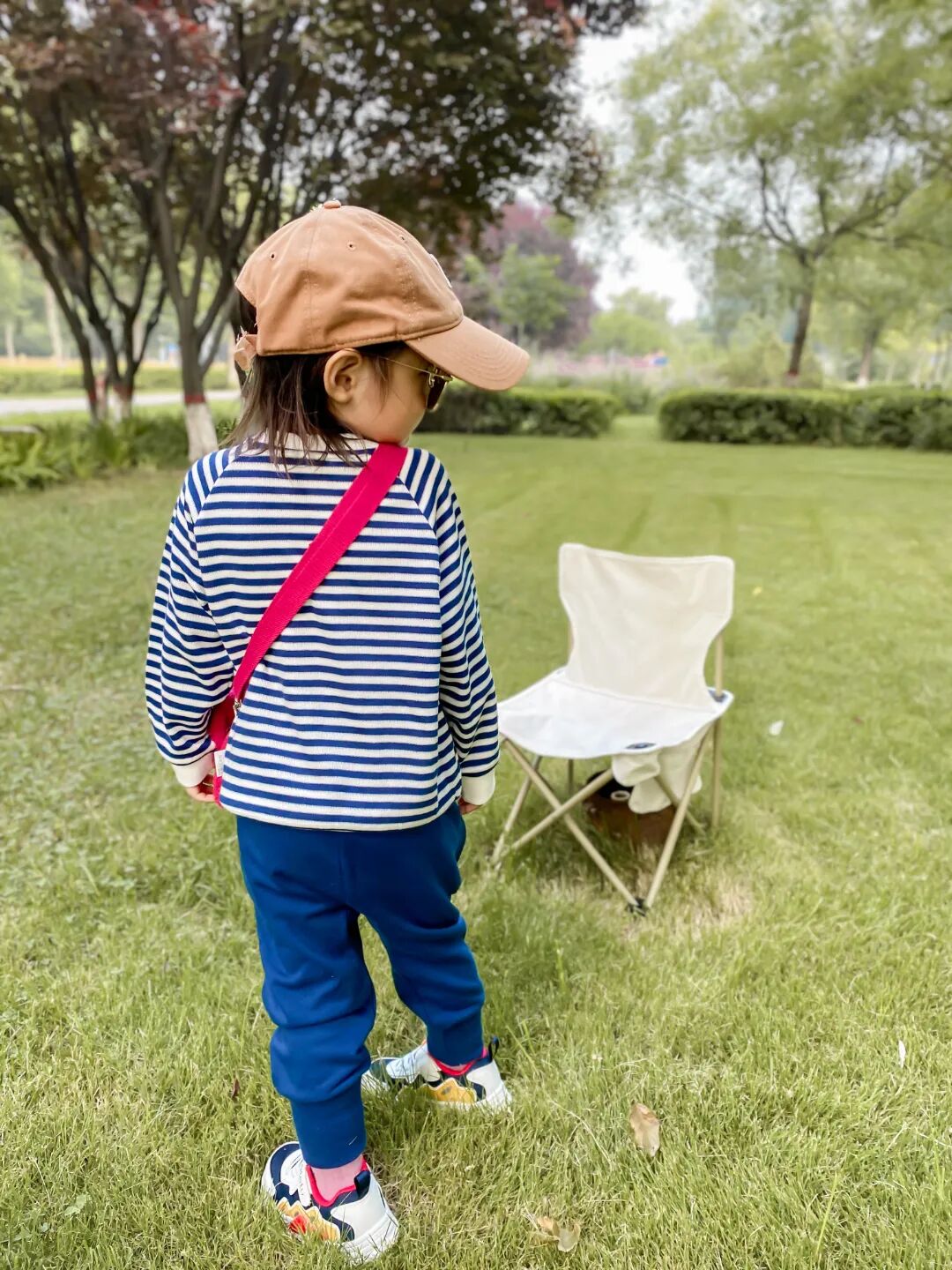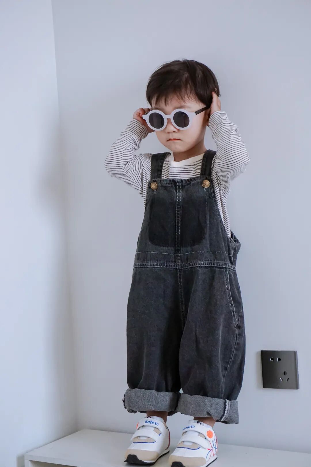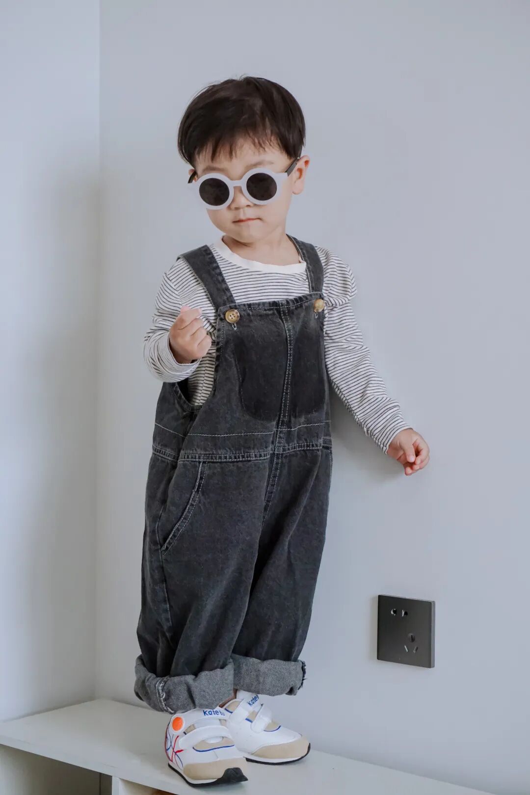 条纹长袖+牛仔背带裤+奶白休闲鞋
