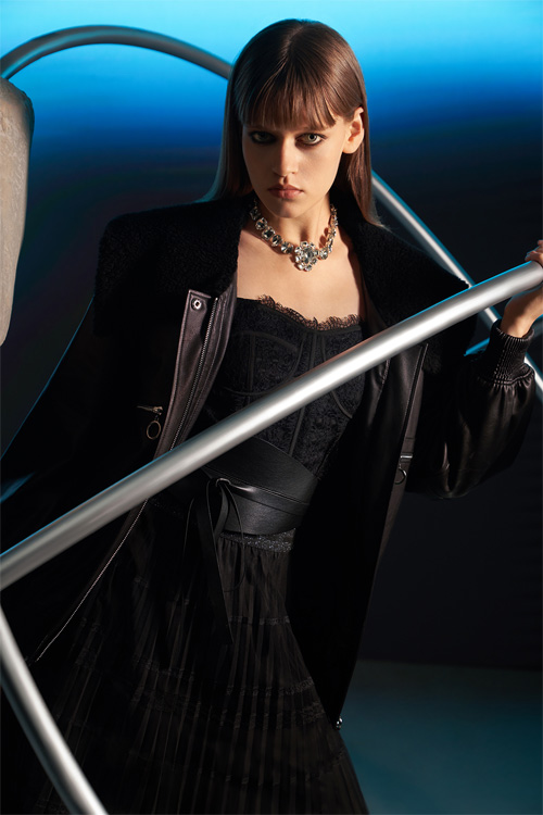 纯黑色的穿搭难免会让人显得过于沉闷,但是这套穿搭却摆脱了纯黑的单调,连衣裙的领口设计露肤度相对较高,让纯黑色调更具灵动的魅力,皮质外套防风保暖,构建了一个以身体为媒介优雅艺术空间。