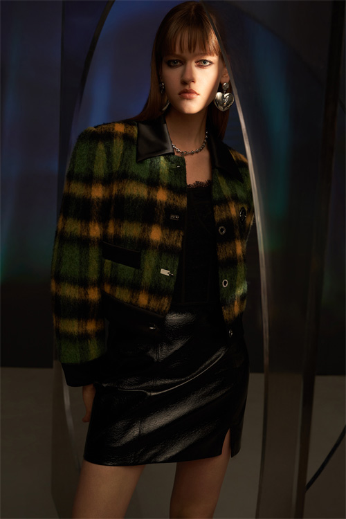 格纹短款大衣外套,墨绿与深黑的格子间偶尔点缀着明黄的色块,温馨如灯光般治愈,皮质面料的领子设计,为穿搭添上几缕酷雅魅力。aitu为所有生活在都市的独立、自立、追求时尚和品质感的现代女性而设计。aitu女性是乐于拥有的个性,是新文化、新时尚易触动的群体,希望通过着装去展示鲜明的自我形象,注重交流且享受生活的乐趣。