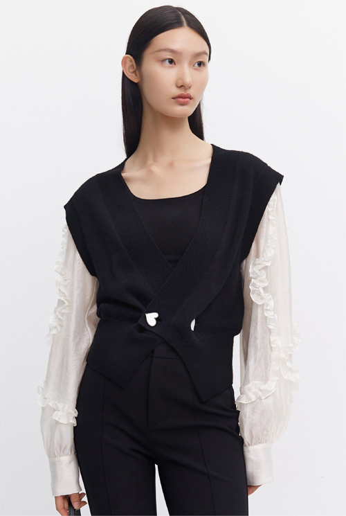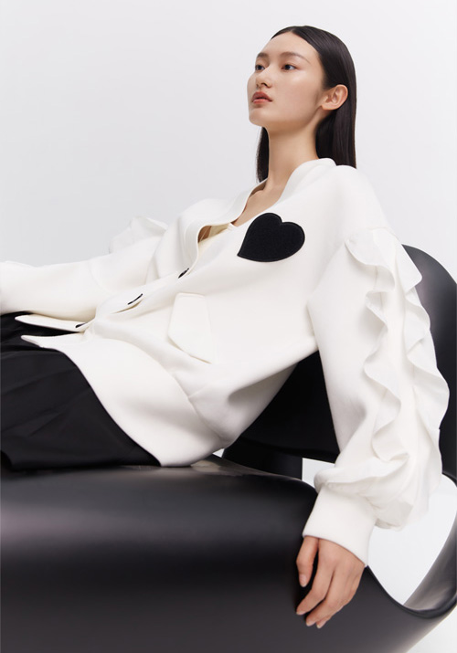 软糯触感的细密针织,拼接品质糅合荷叶袖型设计,巧妙细节提升整体装束,为秋日造型赋予随性与张力。