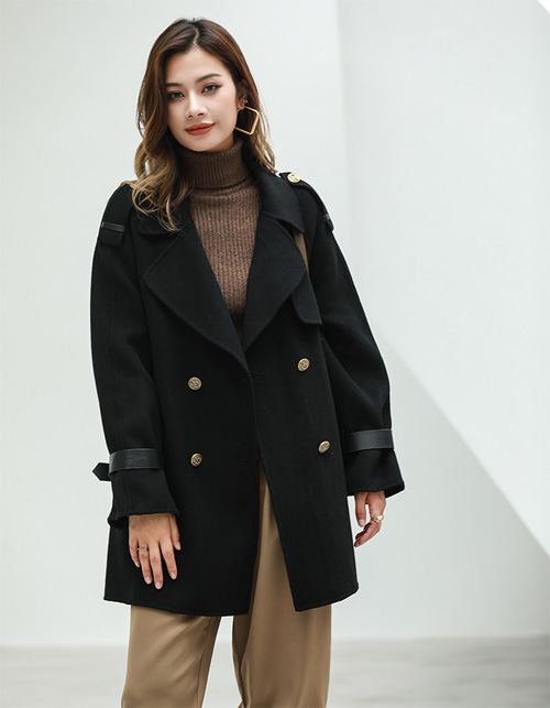 纯黑色的中长款大衣外套,上身防风又保暖,金属色排扣装饰,焕发出复古而优雅的时尚气息,上身既百搭又时髦,为秋日的每一个通勤和休闲时光,增添更多期待。