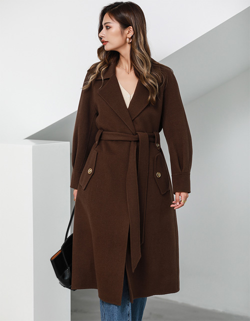 深咖色的大衣外套,有着偏向黑色的沉稳内敛,却又不同于黑色的单调呆板,经典的简约剪裁,腰间用同色系带勾勒身形,加上柔软的面料材质,上身既舒适又具有满满的格调和氛围感。