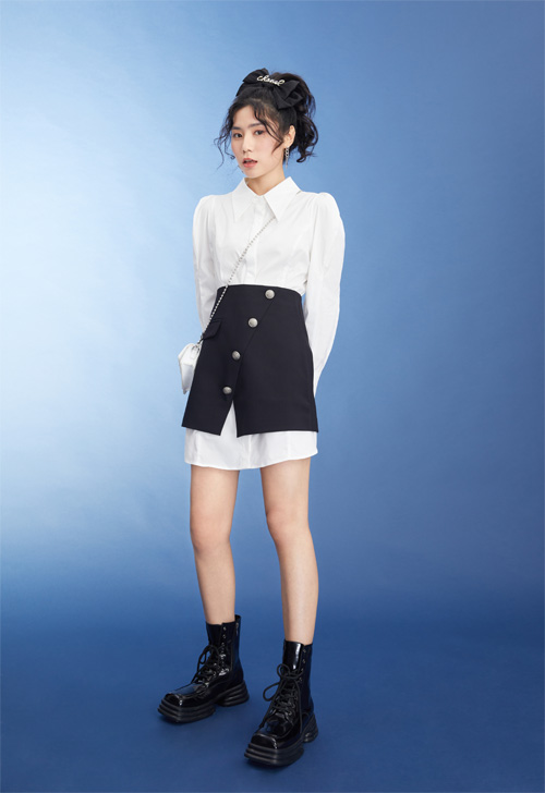 经典白衬衫款式,衬衫看似简单,但却在工艺剪裁上贯彻了法式的优雅韵味,上身非常显瘦显气质,搭配一件高腰黑色半身裙,裙子微微的开叉设计,以及裙摆处的层叠元素,让简约的黑白搭配,焕发出更深层次的优雅魅力。
