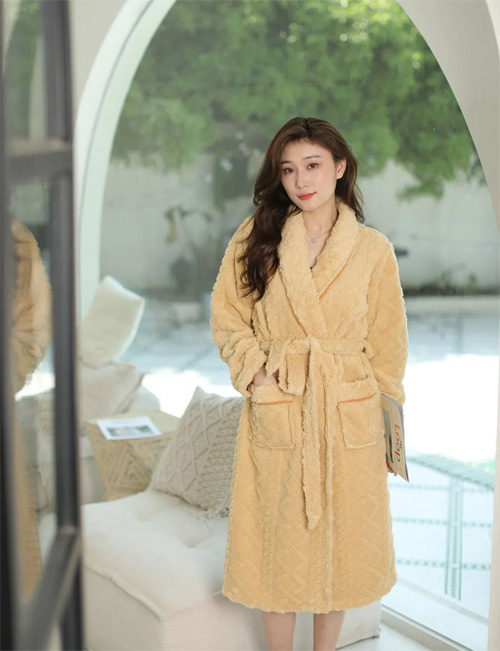此款法兰绒剪花睡袍,温暖又舒适,布面的肌理感造型,细腻又不失品质感,领子与口袋的撞色出芽边,丰富整体层次感。带着慵懒格调的长款睡袍,加长“h”版型设计,合体版型,上身软糯舒适。