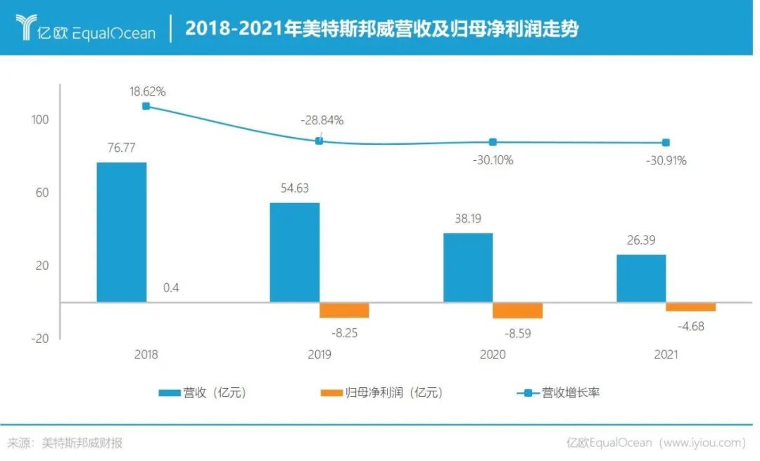 从业绩上看,美特斯邦威早已火烧眉毛:2018-2021年,美特斯邦威分别实现营收76.77亿元、54.63亿元、38.19亿元、26.39亿元,2018年净利 润4036.16万元,2019-2021年分别亏损8.25亿元、8.59亿元、4.68亿元,三年累计亏损超21亿元。