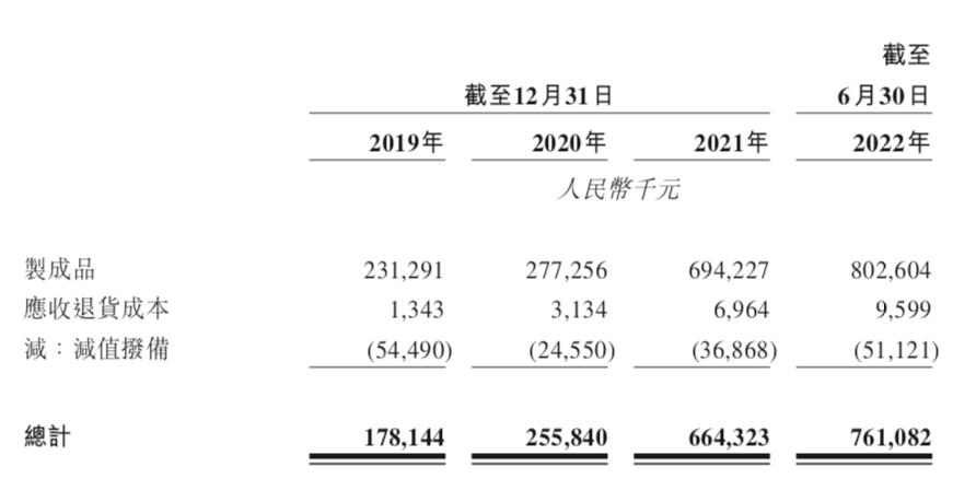 而这其中,退货成本还只占小头,更多是还未售出的库存积压。招股书显示,仅2022年上半年制成品存货就有超过8亿元,是2019年全年的3.47倍。