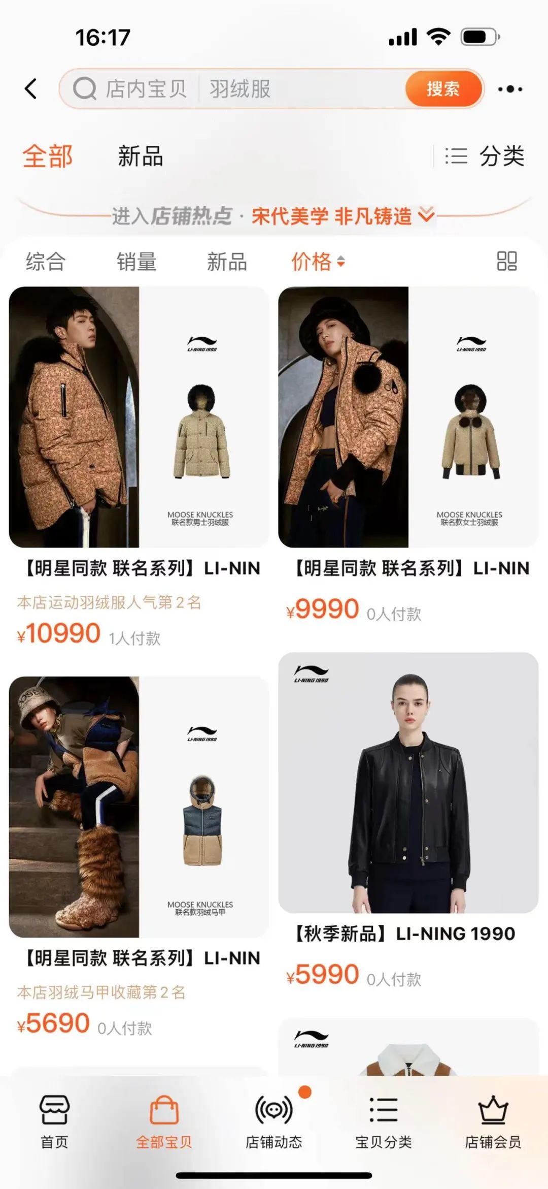 根据浦银国际的数据,“LI-NING1990”的平均吊牌价约为1000元。而「螳螂观察」搜索其天猫旗舰店,发现最贵的一款联名羽绒服,价格已经破万。