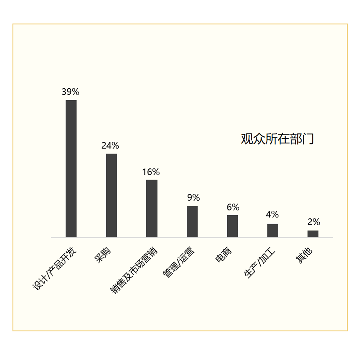 展会短短三天,吸引了10,935名来自全球海内外的专业观众,国内外占比分别为98%、2%。观众主要来源粤、浙、沪这三个地区,占比约90%观众。其中将近60%的观众来自服装品牌、电商/线上零售平台、设计师品牌,最主要目的是为了采购/订货。