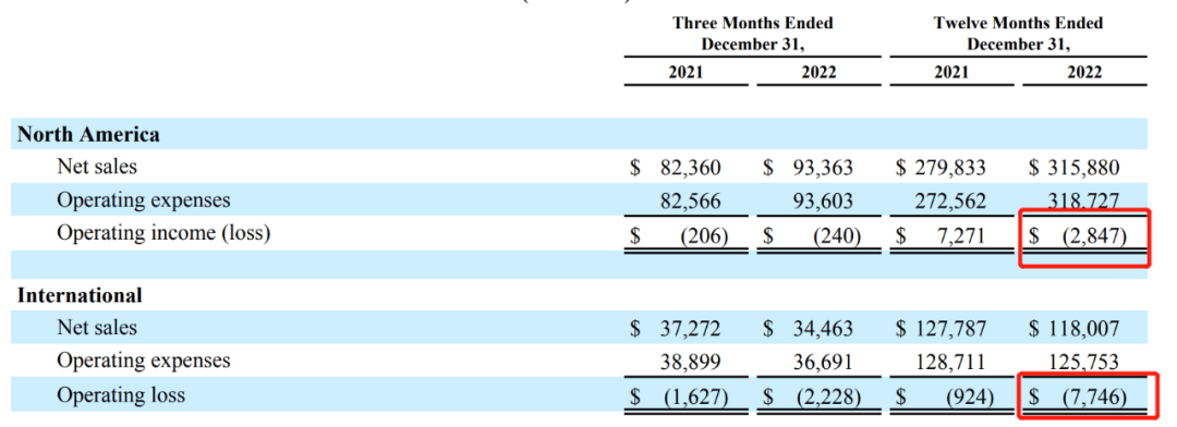 全球新冠病毒疫情基本结束后,部分消费回流到线下实体店,亚马逊传统的零售业务增长受限。叠加通货膨胀和供应链瓶颈等带来的成本上升影响,2022年其北美和国际市场都出现了亏损。