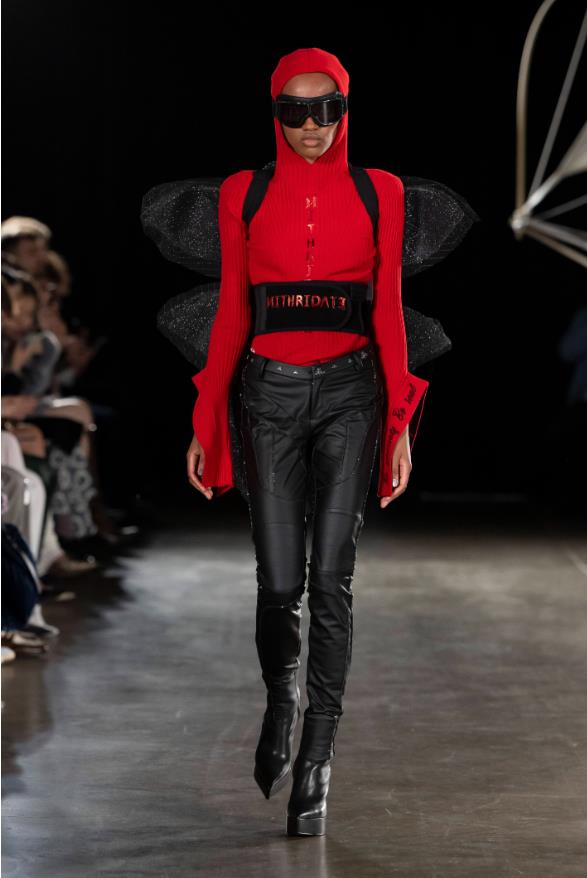 以中性为基础的色调开启了整场秀的大幕,充满解构性的纯素皮革,飞行员夹克与羊毛皮帽描绘出飞行主题下的视觉场景。随之而来各式轻盈的反光面料与大胆先锋的廓形完美组合,呈现出色彩变幻的迷幻效果,诠释了demon女士对于女飞行员阿梅利亚·埃尔哈特(amelia earhart)最后的环球飞行神秘消失的大胆探索与想象,充满别具一格超现实的先锋科技感与艺术之美。