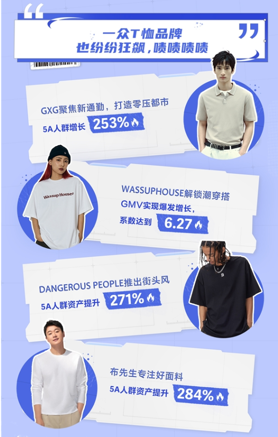围绕t恤这一核心品类,潮流品牌gxg、wassuphouse、dangerous people、布先生也围绕全域场景,创新营销打法,实现生意快速增长,抢占品类中的头部品牌地位。wassuphouse解锁潮穿搭,主推多样复古配色印花设计单品,活动期gmv爆发系数超过6,新客占比达83%,百万以上单品突破2个,5a人群提升2948%,其中a3人群增幅达2046%,实现了爆发性增长且拉新效果显著;gxg聚焦新通勤,打造更适合通勤的青年休闲男装,推出多款凉感、抗皱、易打理单品,活动期5a人群提升253%;dangerous people再造酷设计,重工蜡染技术带来花样质感单品,活动期内gmv爆发系数达到1.15,5a人群提升271%,新客贡献占比60%;布先生专注中高端好面料男士t恤,活动期5a人群提升284%,新客贡献占比76%。